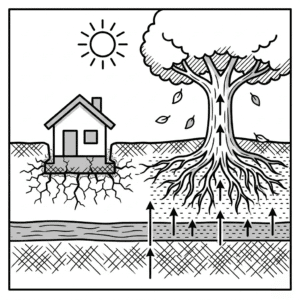Hinzu kommt das Phänomen der Turbosuktion: Wenn ein Baum die Wasserreserven des Bodens schnell erschöpft, wirkt die rund um seine Wurzeln entstehende Trockenzone wie eine „vertikale Pumpe“, die Wasser aus tieferen Bodenhorizonten anzieht. Dieser Mechanismus führt zu einer schnelleren und tieferen Austrocknung des Bodens als ein normaler Regenmangel.