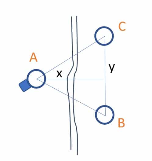 Mit der mitgelieferten 2-Achsen-Schablone werden die P2E1-Platinen entsprechend den drei Markierungen A, B und C befestigt. Beim ersten Mal werden die Messungen AB, AC und BC durchgeführt. Bei den Folgemessungen werden nur die Längen AB und AC gemessen, da BC unverändert bleibt.