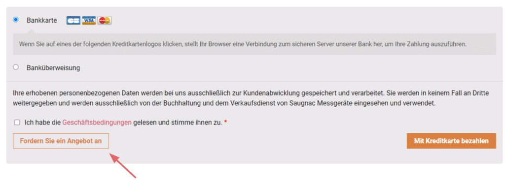 Dann validieren Sie Ihren Warenkorb, indem Sie die Rechnungs- und Lieferadresse angeben. Unterhalb der Auswahl der Zahlungsmethode befindet sich ein Button „Fordern Sie ein Angebot an“